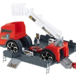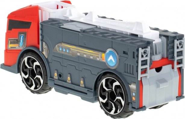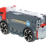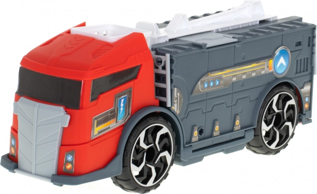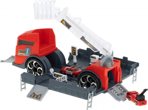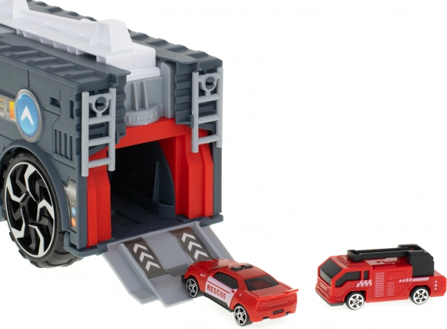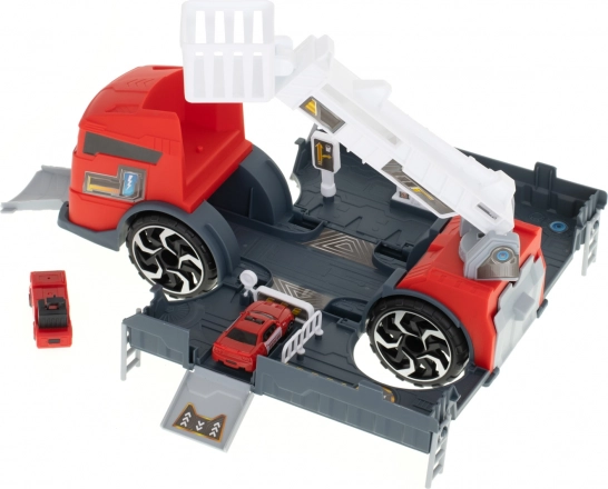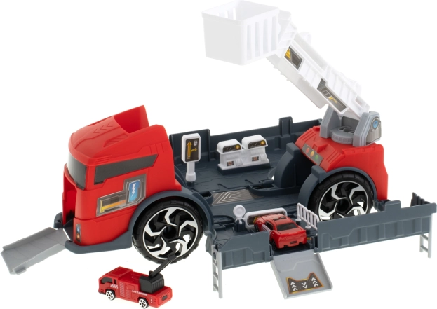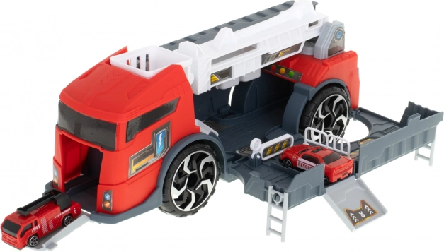 Le camion de pompiers fonctionne comme un transporteur qui acheminera les petites voitures incluses à l’aide d’une rampe.