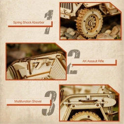 Le modèle comprend des éléments réalistes comme des roues robustes, des ressorts, un fusil d'assaut et d'autres caractéristiques qui ajoutent à l'authenticité.