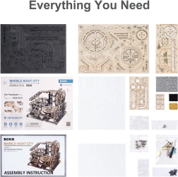 ROKR Marble Night City est un somptueux modèle de circuit de billes 3D qui combine amusement et éducation. Ce modèle se compose de 294 pièces finement découpées, formant un circuit complexe avec divers obstacles et mécanique actionnée par une manivelle. Le paquet comprend un manuel complet pour vous guider à travers le processus de montage.