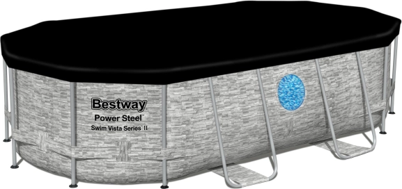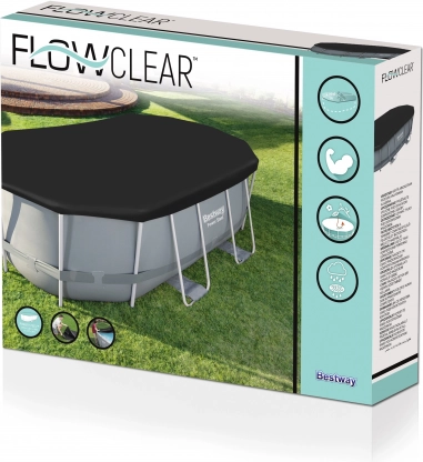L’emballage comprend une bâche de protection pour piscine de dimensions 424 x 250 x 100 cm, adaptée aux piscines Power Steel™ Oval Frame Pools, et conditionnée dans une boîte en carton.
