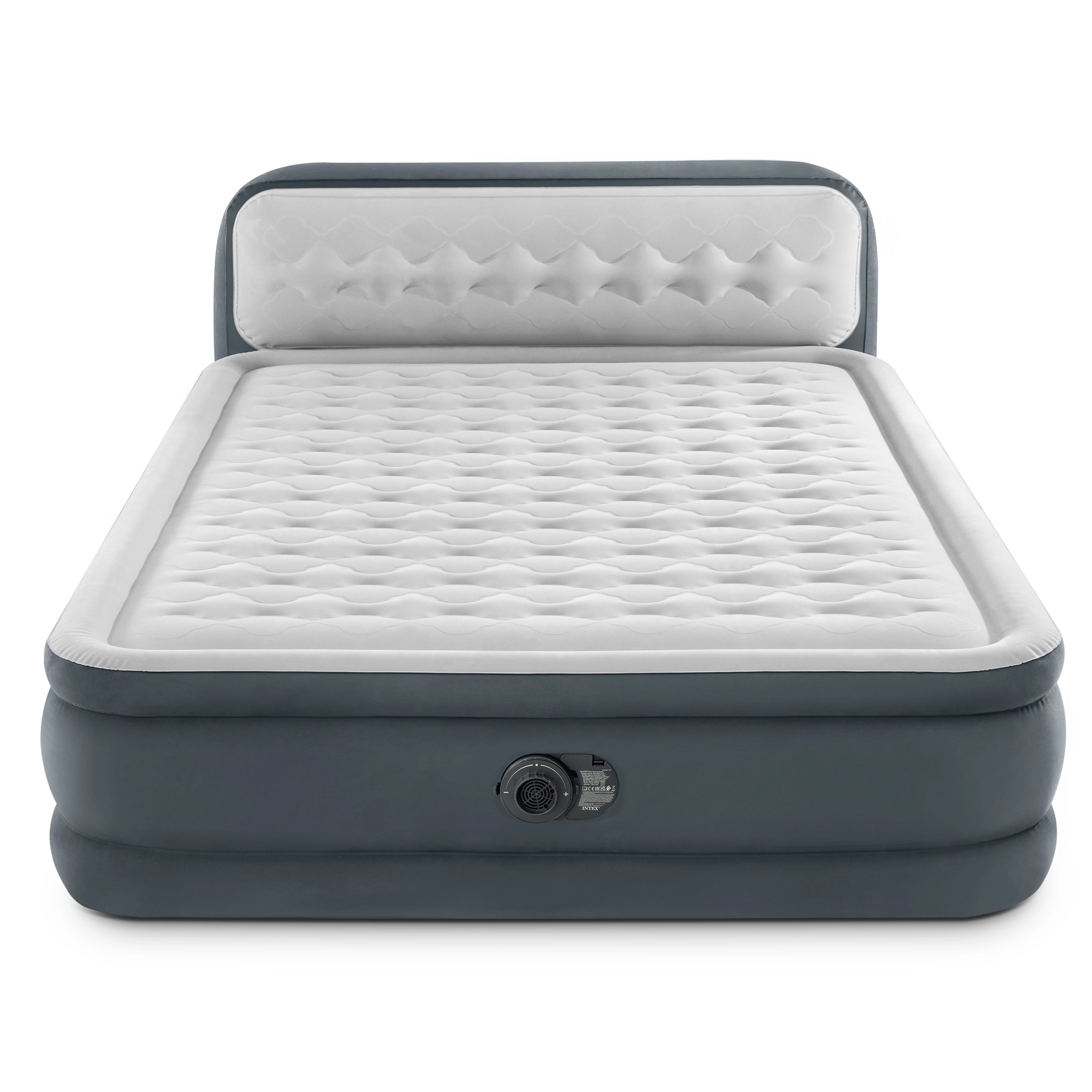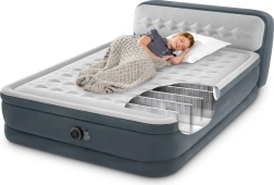 Matelas gonflable INTEX à double paroi avec technologie Dura-Beam Fiber-Tech, offrant une grande surface de couchage, une tête de lit intégrée et une pompe électrique intégrée pour un gonflage et un dégonflage rapides. Hauteur depuis le sol 46 cm et surface en velours doux garantissant confort, stabilité et aspect soigné. La capacité de charge maximale de 272 kg assure un couchage fiable pour deux personnes.