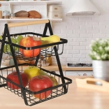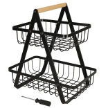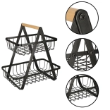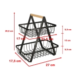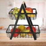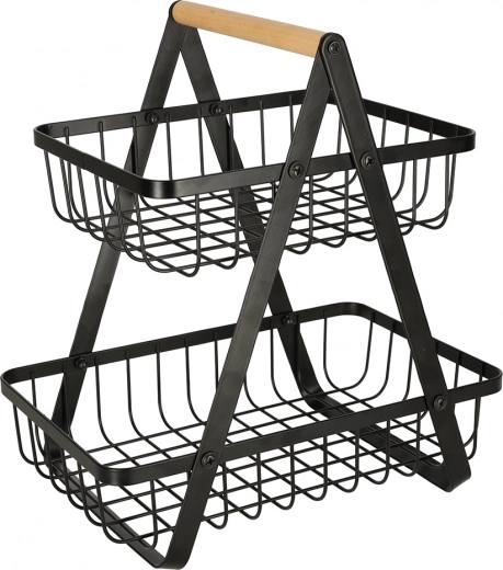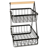 Panier à fruits métallique à deux niveaux avec poignée en bois, noir