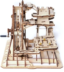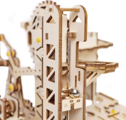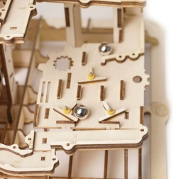 Le modèle comprend un distributeur en tour, des pentes en spirale, un élévateur à grue et à roue, un petit toboggan et des commutateurs judicieusement placés qui modifient la trajectoire des billes. Le niveau de difficulté est évalué à 4/5 ; l’assemblage prend environ 6–7 heures. Une fois terminé, il suffit de tourner la manivelle pour profiter d’un spectacle dynamique illustrant clairement les principes du STEM.