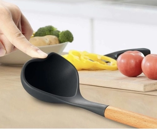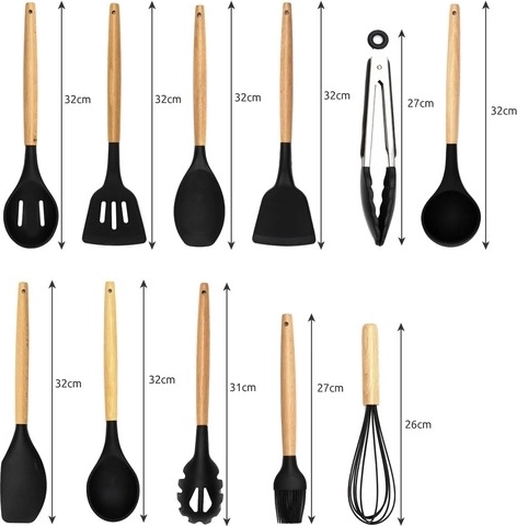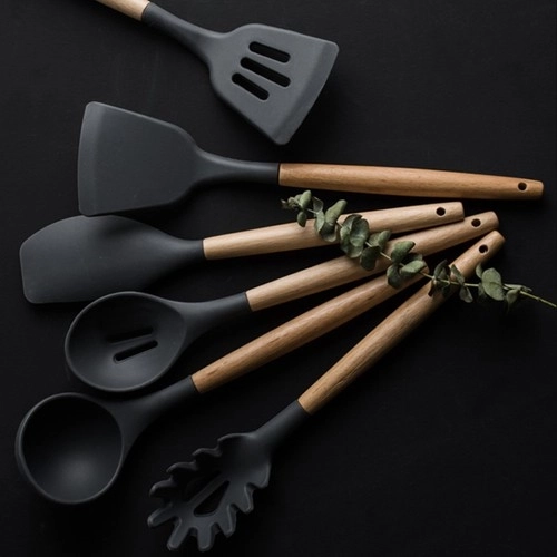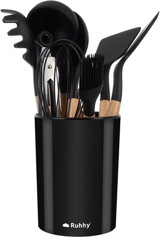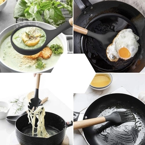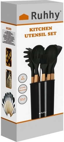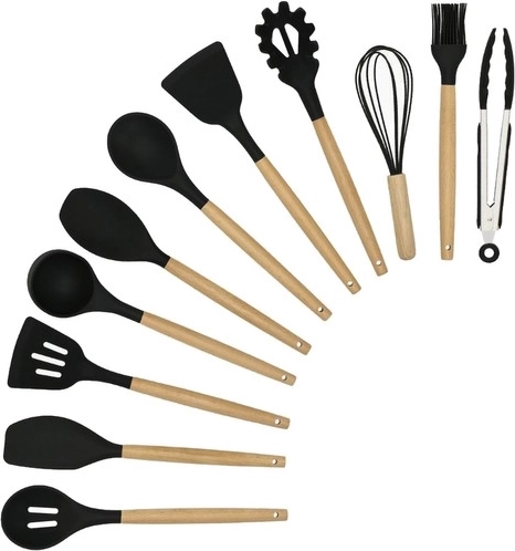 L'ensemble d'ustensiles de cuisine de la marque Ruhhy comprend 12 outils variés, y compris une spatule, une louche et une brosse, tous avec des poignées en bois ergonomiques et des têtes en silicone durables. Ces outils sont résistants aux hautes températures, faciles à nettoyer et empêchent de rayer vos ustensiles de cuisine.