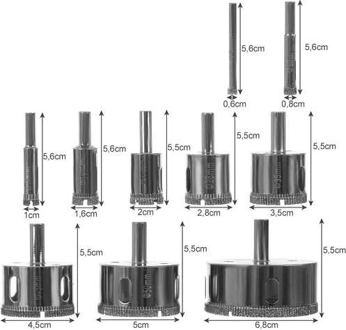 Le jeu de 10 couronnes trépan diamantées BIGSTREN couvre les diamètres les plus courants en plomberie et électricité : 6, 8, 10, 16, 20, 28, 35, 45, 50 et 68 mm. Grâce au revêtement diamant, les couronnes offrent une excellente durée de vie et une précision maximale sans ébréchures des bords des carreaux. Le perçage peut se faire à l’eau pour une longévité accrue et une évacuation thermique plus rapide, ou à sec pour des sections courtes.