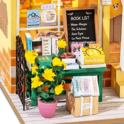 Étagères de livres, ourson adorable, fleurs et accessoires – chaque détail contribue à l’aspect réaliste et enchanteur de la mini-librairie.