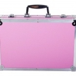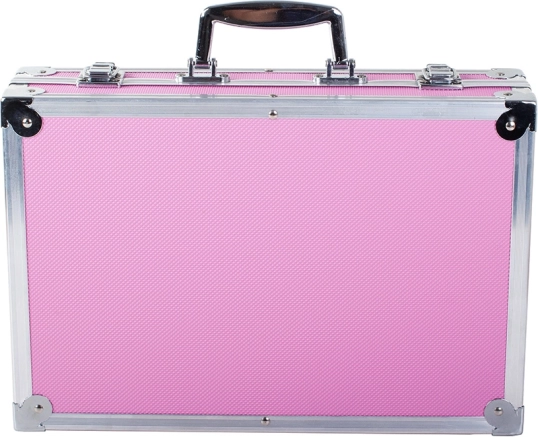 Valise de couleur rose avec coins métalliques offrant une protection robuste et une portabilité facile grâce à la poignée.