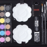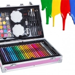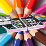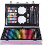 Tous les accessoires nécessaires réunis pour peindre et dessiner. Des crayons de couleur aux aquarelles, l'ensemble contient tout le nécessaire.