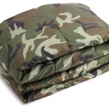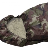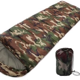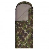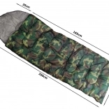 Sac de couchage une place au design camouflage pour le camping et la randonnée. Il possède une fermeture éclair sur toute la longueur, une capuche intégrée avec cordon de serrage et une construction légère et résistante avec isolation en polyester qui conserve efficacement la chaleur. Peut être entièrement ouvert et utilisé comme couverture.