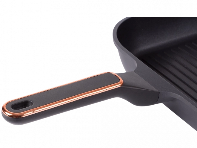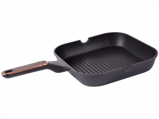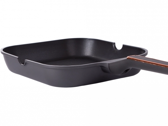 Poêle-grill 28 cm résistante en aluminium moulé sous pression avec revêtement antiadhésif pour une cuisson et un nettoyage faciles. Compatible avec l’induction, le gaz, les plaques vitrocéramiques et électriques. La surface rainurée offre un véritable effet grill, les becs verseurs des deux côtés facilitent l’écoulement et la poignée ergonomique assure une prise en main sûre.