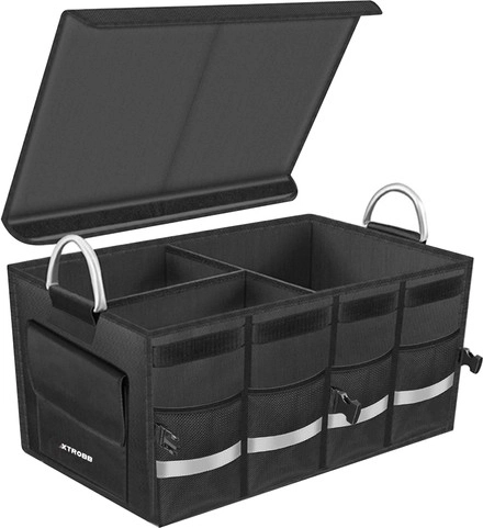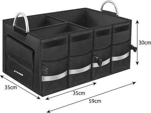 Le grand organisateur de coffre XTROBB, renforcé, aide à maintenir la charge en place en toute sécurité et à garder tout à portée de main. Vous pouvez subdiviser le compartiment principal en jusqu’à trois parties, de sorte que les outils, les produits d’entretien automobile, les câbles et les petits objets restent bien organisés et ne se déplacent pas pendant la conduite. Le couvercle à velcro refermable protège le contenu de la poussière et assure une apparence propre du coffre.