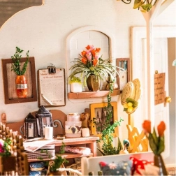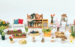 Fleurs miniatures, mobilier, coussins et accessoires créent l’atmosphère fidèle d’une terrasse de jardin – idéale comme décoration élégante pour la maison.