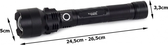 Puissante lampe torche tactique BAILONG avec diode CREE XHP50 offrant une portée jusqu’à 1000 m, un zoom progressif et 3 modes d’éclairage. Corps résistant en aluminium aéronautique avec protection IPX5, revêtement antidérapant et indicateur de charge LED, garantissant une fiabilité sur le terrain. L’alimentation est assurée par 2× 26650 accus et une recharge USB pratique.