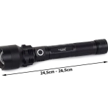 Le corps robuste en aluminium aéronautique avec anodisation dure est résistant aux chocs et protégé selon la norme IPX5. Le revêtement antidérapant, la poignée ergonomique et la dragonne augmentent la sécurité de prise en main. Deux accus 26650 assurent une grande autonomie, la recharge USB est pratique sur le terrain et le voyant LED indique l’état de charge. 3 modes sont disponibles – 100 %, 50 % et stroboscope.