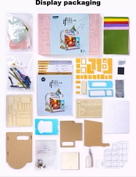 Le kit est livré en pièces détachées et contient tous les outils nécessaires, y compris la colle, les peintures et le pinceau. Le montage s’effectue principalement avec des pièces pré-découpées en contreplaqué, des éléments en carton et en tissu. Pour faciliter l’installation de l’éclairage, nous recommandons d’utiliser une pince ronde, mais de simples ciseaux suffisent également.