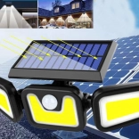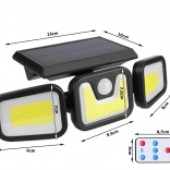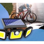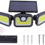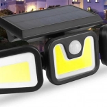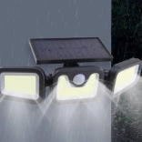 Lampe de sécurité solaire moderne avec 3 panneaux LED réglables, capteur de mouvement et de crépuscule et télécommande. Grâce à l’alimentation solaire et à une batterie haute capacité, elle fonctionne sans câbles, est étanche IP67 et idéale pour éclairer entrées, cours, garages et jardins.