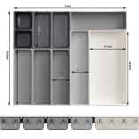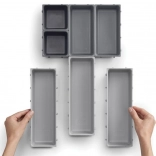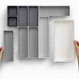Le lot comprend 10 bacs de tailles différentes, que vous reliez aisément grâce aux crochets intégrés. Grâce à ses dimensions compactes, il s’adapte à la plupart des tiroirs standards et crée un système clair pour les couverts, couteaux, fouets, éplucheurs ainsi que pour de petits objets de bureau ou de loisirs créatifs.