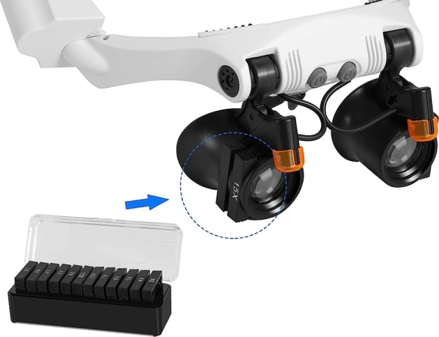 Vous pouvez l'utiliser pour la réparation de mécanismes délicats, l'observation de bijoux ou de pièces. Grâce à ses 14 lentilles interchangeables, elle permet jusqu'à 21 combinaisons d'agrandissement différentes.