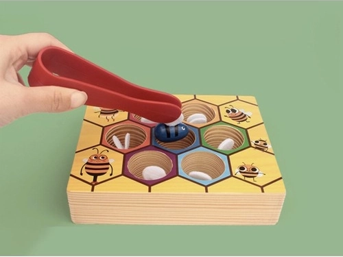Attraper les abeilles par leurs ailes à l’aide de la pince renforce les petits doigts, améliore la préhension et la coordination œil–main. Un défi ludique qui apprend la précision et la patience.
