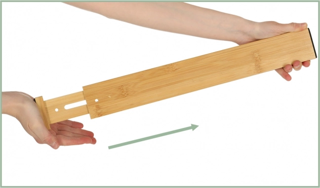 La cloison de séparation en bambou non seulement garde vos tiroirs bien rangés, mais leur ajoute également un aspect esthétique. La cloison est équipée de protections en mousse sur les bords qui protègent le tiroir des rayures et empêchent l'organisateur de glisser lors de l'ouverture. Son utilisation est très simple : il suffit de choisir un tiroir, de presser la cloison à la plus petite taille et de la placer à l'endroit souhaité. Le produit s'adapte automatiquement à la forme de votre tiroir.