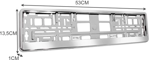 Contenu de l'emballage : 2x cadre pour plaques d'immatriculation de dimensions 53 x 13,5 x 1 cm et d'un poids de 381 g chacun, poids total de l'emballage 538 g.