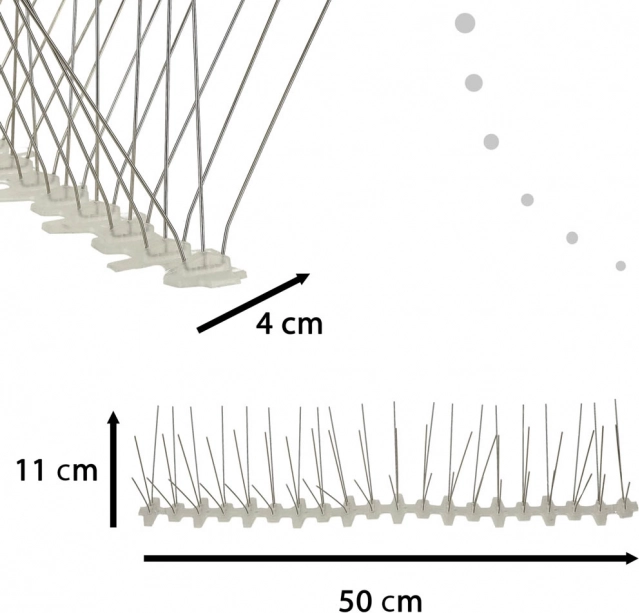 Un segment de 50 cm de long avec des pointes de 11 cm de hauteur est idéal pour une installation sur rebords de fenêtre, corniches, garde-corps, gouttières ou toitures. La base peut être raccourcie et ajustée selon les besoins. L’installation est rapide – via les trous prévus ou avec de la colle.