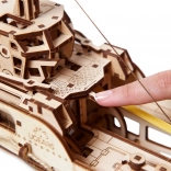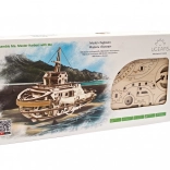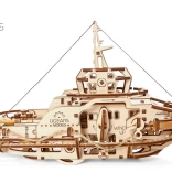 Ce remorqueur minutieusement détaillé de UGEARS se compose de 169 pièces découpées au laser dans un contreplaqué de qualité. Les pièces se détachent facilement des plaques et s’assemblent sans colle ni outils spéciaux – il suffit de suivre le manuel fourni. Le modèle est propulsé par un moteur à élastique, des engrenages et un pendule, assurant un mouvement fluide et authentique.