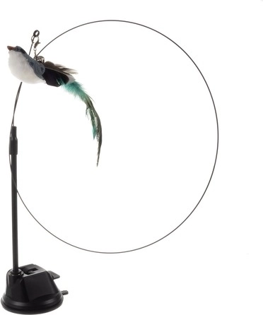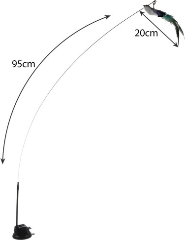 La longue baguette élastique avec des éléments attrayants à l’extrémité capte l’attention du chat et l’encourage à sauter et à attraper. Le petit oiseau orné de longues plumes et d’une clochette délicate renforce l’attrait.