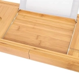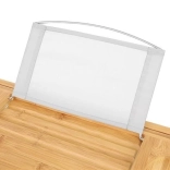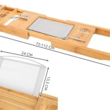 Profitez d’un moment de détente dans le bain avec une élégante étagère en bambou offrant une longueur extensible, un support pour livre ou tablette avec 3 angles d’inclinaison, un emplacement pour verre de vin, un porte-savon, un insert amovible pour serviette et un espace pour bougie. Le bambou résistant est imperméable, sèche rapidement et se nettoie facilement – idéal pour votre spa à domicile.