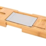 Sa conception pratique comprend un support pour tablette/livre avec butée métallique et 3 positions, un emplacement dédié pour verre, un porte-savon amovible et un insert pour serviette, ainsi qu’un renfoncement pour bougie ou parfum. Le bois de bambou est naturellement résistant à l’humidité, facile à entretenir et apporte une note élégante à la salle de bain.