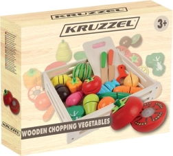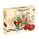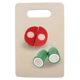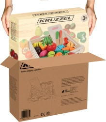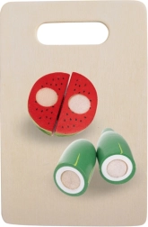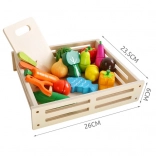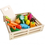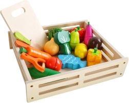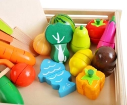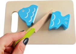 Les fruits, légumes et le poisson segmentés se “découpent” facilement avec le petit couteau en bois grâce aux bandes auto-agrippantes et se reconnectent ensuite. Un excellent entraînement de la motricité fine et du jeu de rôle.
