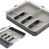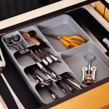 Cet organisateur de cuisine en plastique gris aide à garder votre tiroir bien rangé. Avec son design ajustable et ses compartiments pratiques, il est idéal pour le rangement des ustensiles de cuisine.