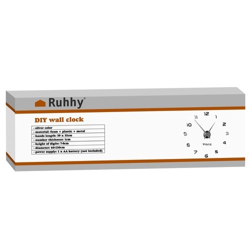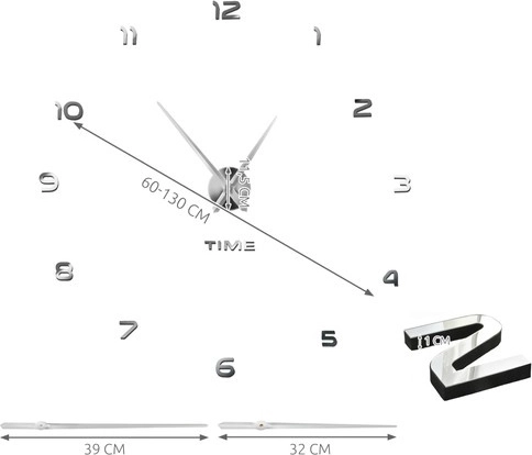 Horloge murale moderne à monter soi‑même avec diamètre réglable 60–130 cm, idéale pour sublimer tout intérieur. Les chiffres 3D argentés brillants à effet miroir offrent un design élégant, et le mouvement silencieux à balayage continu sans tic-tac assure la tranquillité au salon comme dans la chambre. Grâce au gabarit fourni et aux chiffres autocollants, l’installation est rapide et facile. Alimentation par 1× pile AA (non incluse).