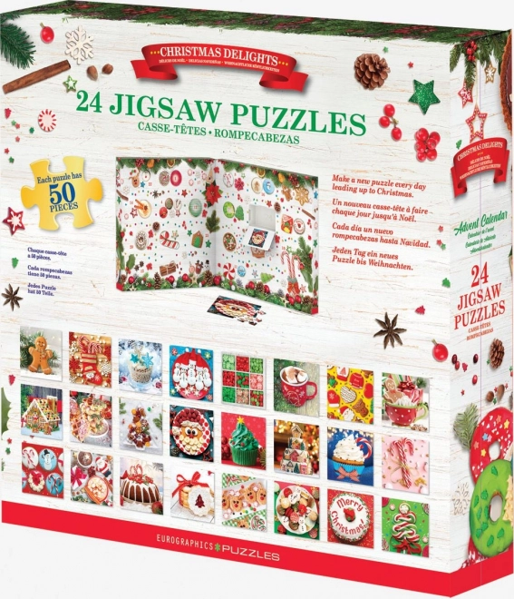 Ce calendrier de l’Avent EUROGRAPHICS apporte de la joie à chaque jour de décembre. Derrière les 24 fenêtres se cachent 24 puzzles différents, chacun avec 50 pièces et un joli motif de Noël. Les images sont carrées et, une fois assemblées, mesurent environ 12,5 × 12,5 cm. Un modèle est inclus dans chaque fenêtre pour faciliter l’assemblage et le dos de l’emballage présente l’aperçu de tous les motifs.