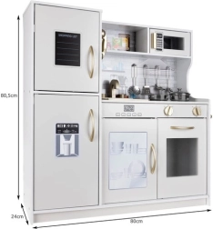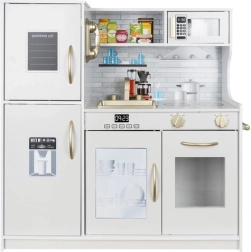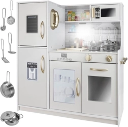 La cuisine XL en bois élégante de la marque KRUZZEL en blanc avec des détails dorés offre un jeu réaliste grâce à un éclairage LED, aux sons des brûleurs et à un riche ensemble d’accessoires. Sa structure en bois robuste, ses portes à fermeture « clic », un évier amovible et des appareils comme le four et le micro-ondes stimulent le jeu créatif et le développement de la motricité fine.