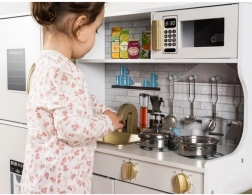 Cette cuisine XL en bois est conçue pour des heures de jeu. L’éclairage LED intégré peut être placé sous un meuble, dans un placard ou dans le four, et les interrupteurs rotatifs à clic renforcent l’impression de cuisiner réellement. Sa structure robuste en MDF et son élégante finition blanc-or embelliront la chambre des enfants.