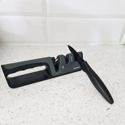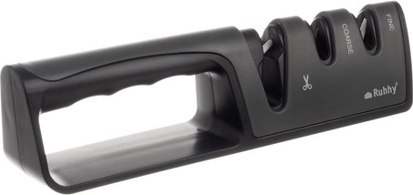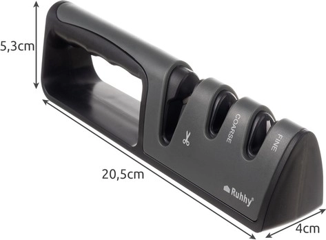 Gardez vos couteaux de cuisine et vos ciseaux toujours parfaitement affûtés grâce à l’aiguiseur manuel RUHHY à trois niveaux d’affûtage – pour ciseaux, affûtage grossier et fin. Sa poignée ergonomique, sa base antidérapante et son format compact assurent un affûtage rapide, sécurisé et efficace dans toute cuisine.