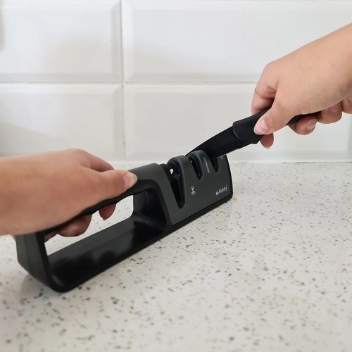 Le pratique aiguiseur RUHHY à 3 phases restaure le tranchant de vos couteaux et ciseaux de cuisine en quelques passages. La première fente est destinée aux ciseaux, la deuxième au réaffûtage grossier des lames abîmées et la troisième à l’affûtage fin et au polissage. Sa construction stable avec patins antidérapants et poignée ergonomique garantit une utilisation confortable et sûre.