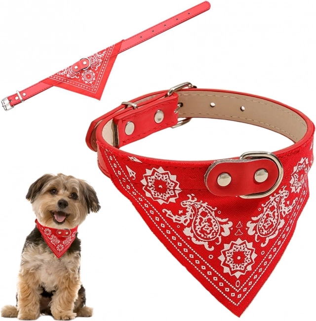 Collier stylé avec bandana pour chiens et chats, qui allie confort, sécurité et style bandana tendance. Grâce à sa boucle métallique réglable et à son anneau en D pour la laisse, il est idéal pour les promenades quotidiennes comme pour les moments spéciaux. Taille M (29–34 cm). Les couleurs sont fournies en assortiment sans possibilité de choix.