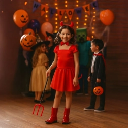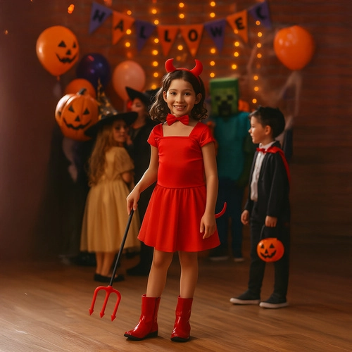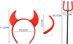 Costume complet de petit diable pour enfants et adultes avec 4 accessoires : cornes sur serre-tête, noeud papillon, queue et trident. Taille universelle avec élastiques pour un port confortable. Excellent choix pour Halloween, carnaval, fêtes d’anniversaire ou événements à thème – créez en un instant un déguisement marquant et amusant.