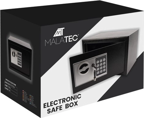 Le coffre-fort électronique pratique MALATEC XL allie la commodité du verrouillage par code à la sécurité d’une clé mécanique. Il accueille facilement argent, bijoux, documents jusqu’au format A5 et autres objets de valeur. Après trois erreurs, il passe en verrouillage de 30 secondes avec signal lumineux et sonore; des LED indiquent l’état de piles faibles.