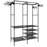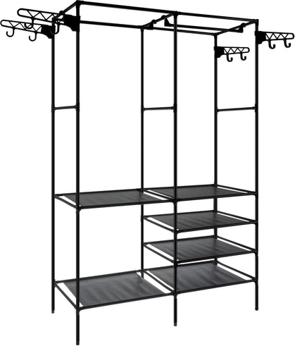 Six étagères, une tringle et huit crochets latéraux accueillent vêtements, chaussures, boîtes et accessoires. Le design ouvert assure une vue d’ensemble rapide et un accès facile.