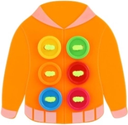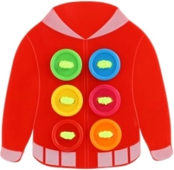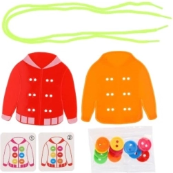 Jouet éducatif sensationnel pour développer des compétences manuelles, l'apprentissage des noms de couleurs et le comptage. Le jeu inclut la couture de boutons sur une veste à l'aide de ficelles.