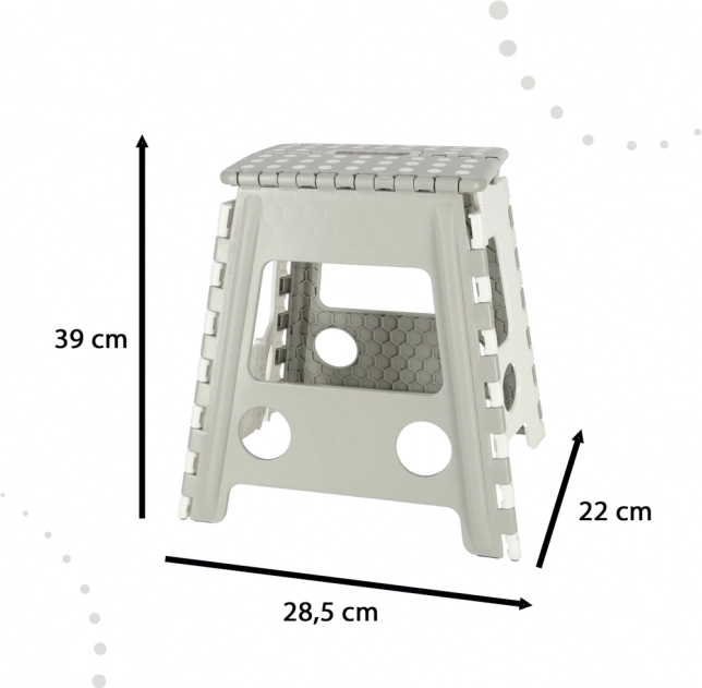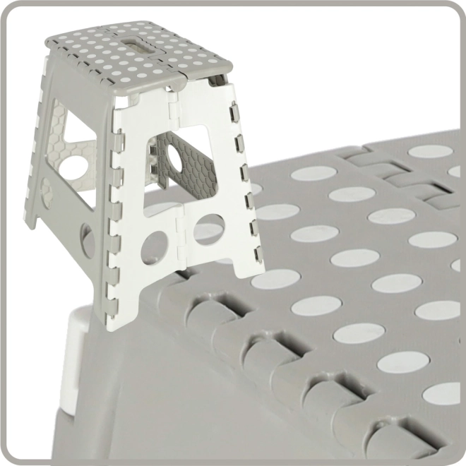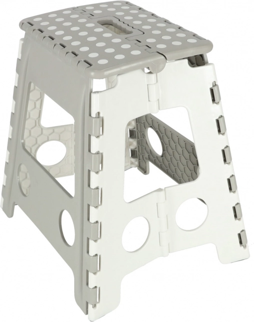 Tabouret pliant léger et robuste de couleur gris clair ajoute les 39 cm de hauteur nécessaires, offre une capacité de charge jusqu’à 150 kg et une surface antidérapante pour une montée en toute sécurité. Grâce à sa structure pliable et à sa poignée, il se transporte et se range facilement.