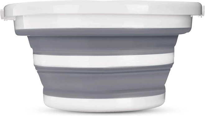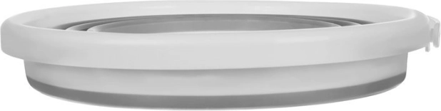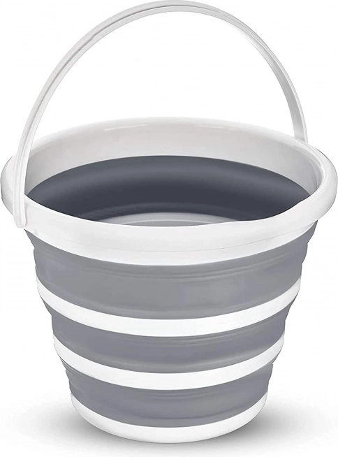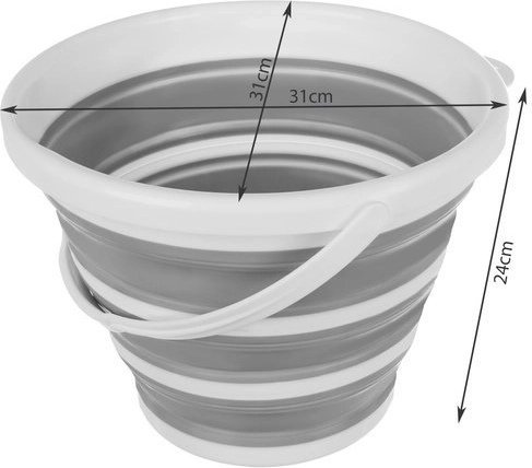 Une fois plié, le seau ne mesure qu’environ 5 cm de hauteur, ce qui lui permet de se glisser facilement dans une armoire, un coffre de voiture ou un camping-car. La poignée pratique et l’ouverture pour la suspension facilitent le transport et le rangement.