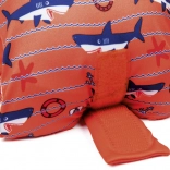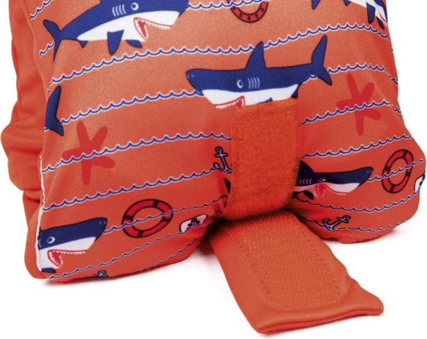 Le coloris orange vif avec de joyeux requins encourage les enfants à passer du temps dans l’eau et améliore la visibilité.