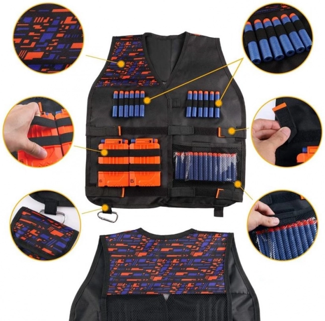 Contenu du set : Le set comprend un gilet tactique pare-balles, des lunettes de protection, 30 fléchettes, un bandana imprimé pour le visage, un bracelet porte-munitions à porter au poignet et un chargeur de munitions supplémentaire.