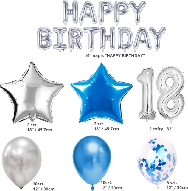 L'ensemble de ballons pour le 18e anniversaire est un choix idéal pour la décoration de votre espace de fête. Grâce à sa combinaison de couleurs originale, il est idéal pour des célébrations aussi bien à l'intérieur qu'à l'extérieur.