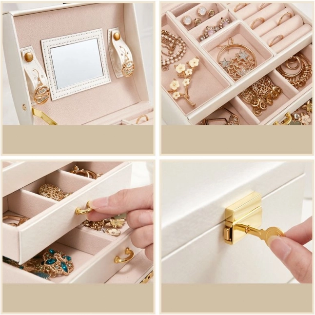 Parmi les effets personnels de chaque femme, les bijoux occupent une place importante. La boîte à bijoux multi-niveaux est un produit indispensable et fiable pour ranger vos trésors. Des compartiments et tiroirs séparés offrent un rangement parfait pour boucles d’oreilles, bracelets, montres, chaînes, lunettes et autres objets précieux. La boîte à bijoux élimine le problème des chaînes emmêlées, de l’usure et des rayures. Le rembourrage doux protège vos précieux bijoux contre les éraflures. L’écrin dispose d’un grand miroir amovible, idéal pour essayer les bijoux et se maquiller.