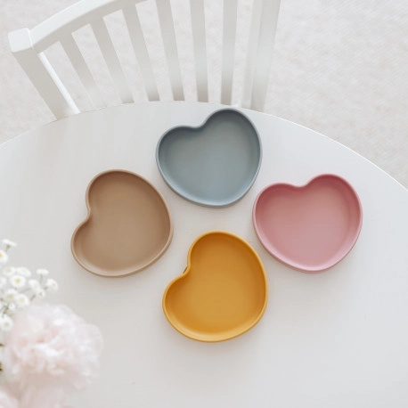 Assiette pour enfant élégante en silicone sûr avec une ventouse pratique en forme de cœur. Tient fermement sur la table, idéale pour les premières purées et le BLW, résistante et flexible, compatible lave-vaisselle et micro-ondes et sans BPA.